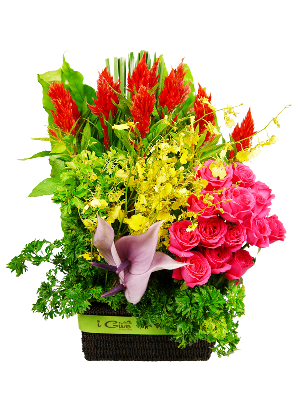 Dark Pink Rose, Purple Anthurium, Cristata Plumosa, Dancing Lady Orchid, Bulrush, Greens