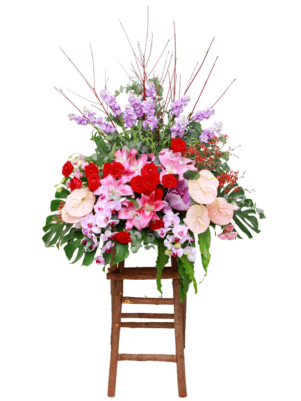 Pink Anthurium, Butterfly Orchid, Flowering Cabbage, Red Rose, Pink Lily, Purple Lilac, Orchid, Greens