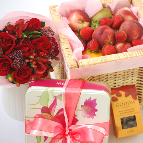 1 box of Bengawan Solo mooncake, fruits and Godiva chocolate with floral bouquet as shown