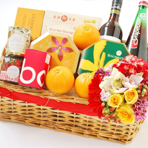 $2298Chinese new year hamper of 8 mandarin Oranges, Godiva Chocolate pretzel, Macadamia cookies, Bengawan Solo Sugee, Bengawan solo pineapple tarts, Crabtree & Evelyn Jam, Crabtree & Evelyn Cookies, Sparkling red grape juice, Jacob creek merlot , Birdnest with rock sugar with Floral Decor