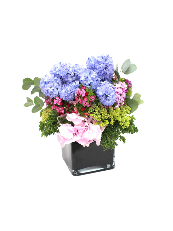 Hyacinth, Pink Hydrangea, Dianthus, Eucalyptus, Greens