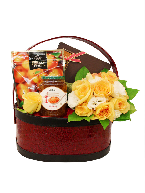 Lo Hong Ka Instant Red Birdnest (350ml), Godiva Chocolate (Carrés - 16pcs), Forest Feast Malatya Dried Apricots (250g) with seasonal flower bouquet
