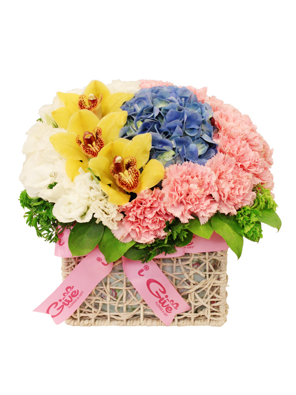 Yellow Cymbidium, Blue Hydrangea, Pink Carnation, Lisianthus, Greens