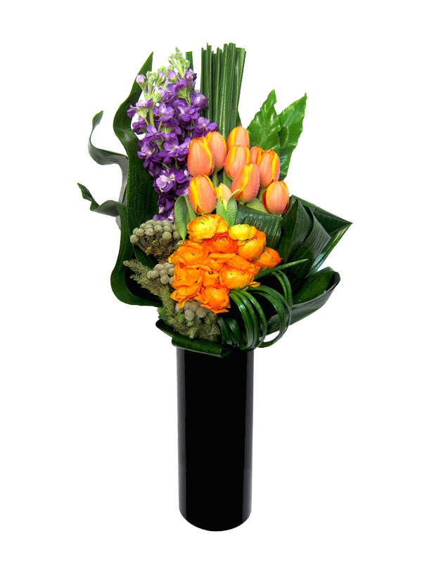 Orange Tulip, Orange Ranunculus, Purple Lilac, Berzelia, Bulrush, Greens