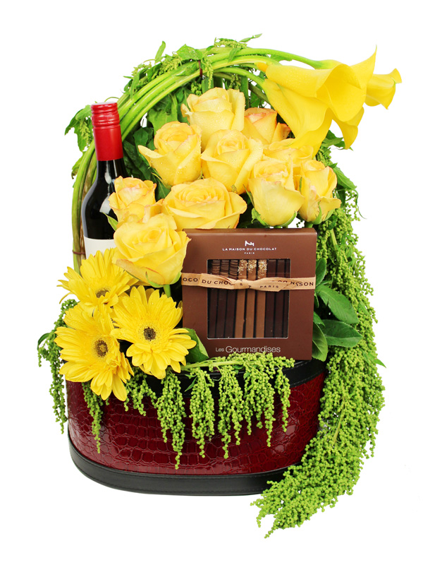 Penfolds Red Wine (750ml), La Maison du Chocolat - Praline Sticks Chocolate (60g), Yellow Calla Lily, Yellow Rose, Yellow Gerbera, Esprenium, Greens