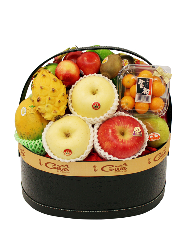 Assortment of 12 seasonal fruits (Pitahaya, Japan Apple, Kumquat, Papaya etc) presented in a synthetic leather container